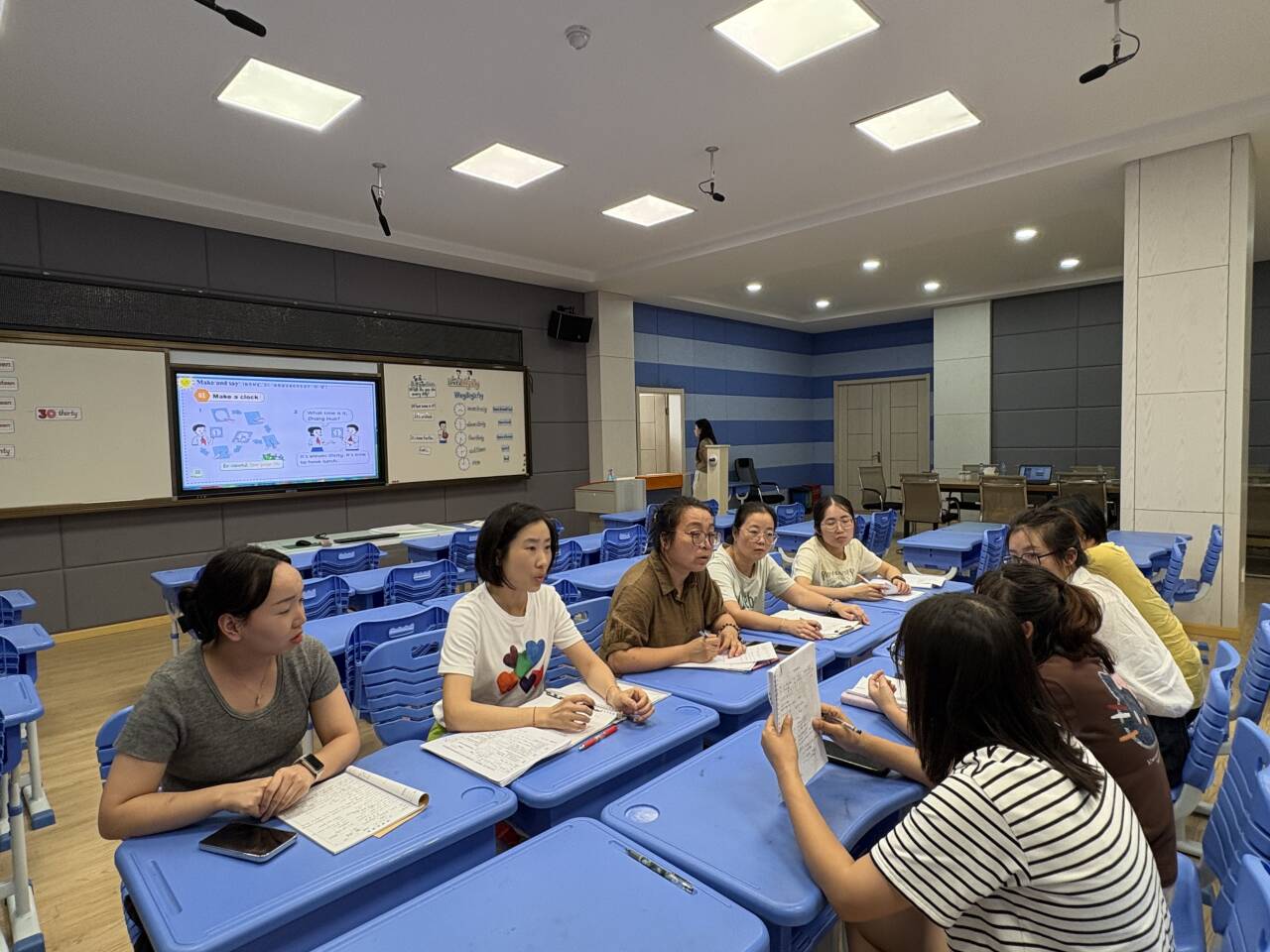 观课结束后,主评周晨老师从24小时制和12小时制对比练习、重点句型解析以及教学评价等方面进行了亮点回顾并提出了商榷建议。其他老师从板书规范,语言材料积累,语言框架的搭建,重音标识及重音降调,深化情感教育,育人价值等方面提出了宝贵建议。