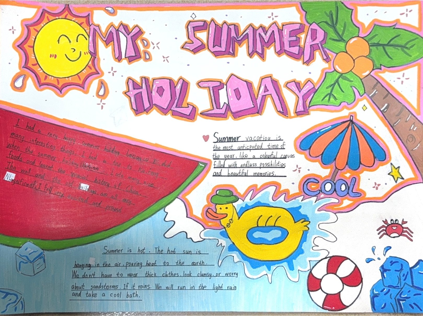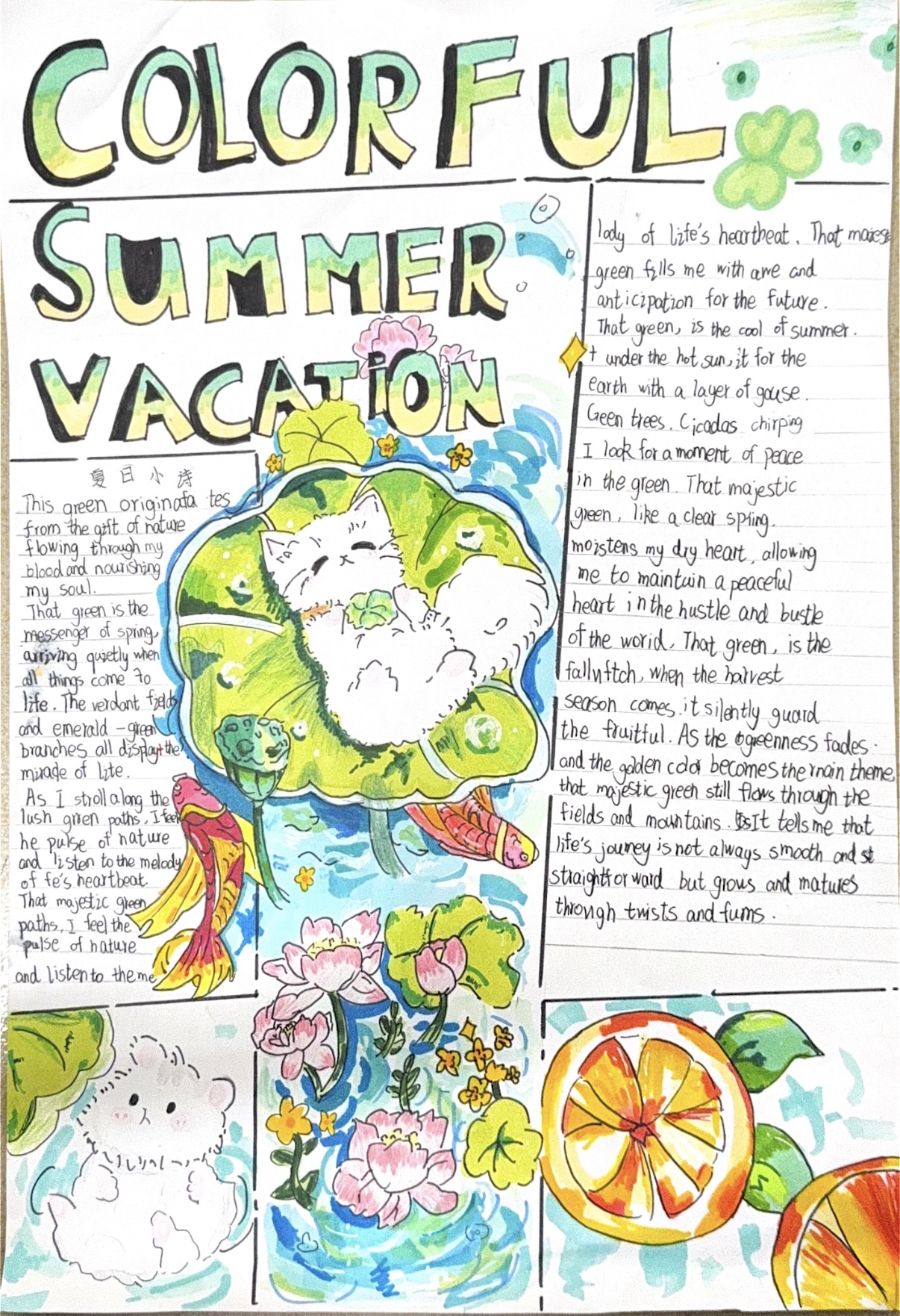 这个暑假,孩子们制作了一张张精美的英语手抄报,英文与美术的完美融合!孩子们结合缤纷的色彩和精美的图画,进行了细致的绘制。从构思、编排,到书写、绘画,最后定稿,都是孩子们独立完成。丰富的版面,整洁的书写,传递着他们对英语的喜爱,对美的追求!