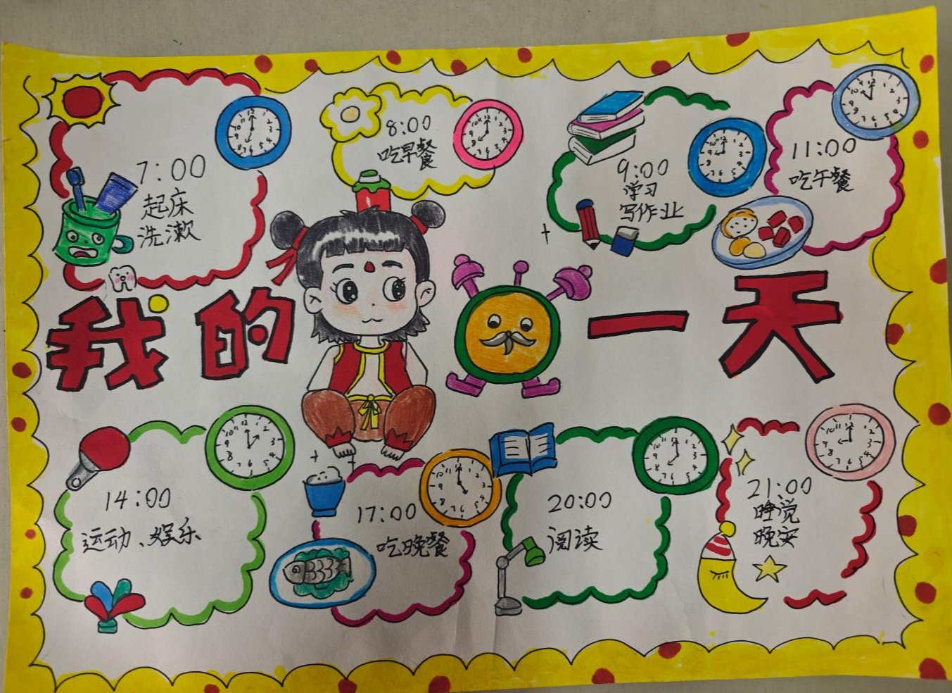 在数学的世界里,时间被赋予了精准的计量。为了让孩子们更深刻地理解时间的价值,体验数学与日常生活的紧密结合,设计了一项有趣的手抄报作业——《我的一天》。孩子们纷纷化身为时间管理者,精心规划并记录了自己一天中的每个重要时刻。通过这样的实践,他们不仅领悟到了时间管理的艺术,更在创作中展现了自己的独特创意。